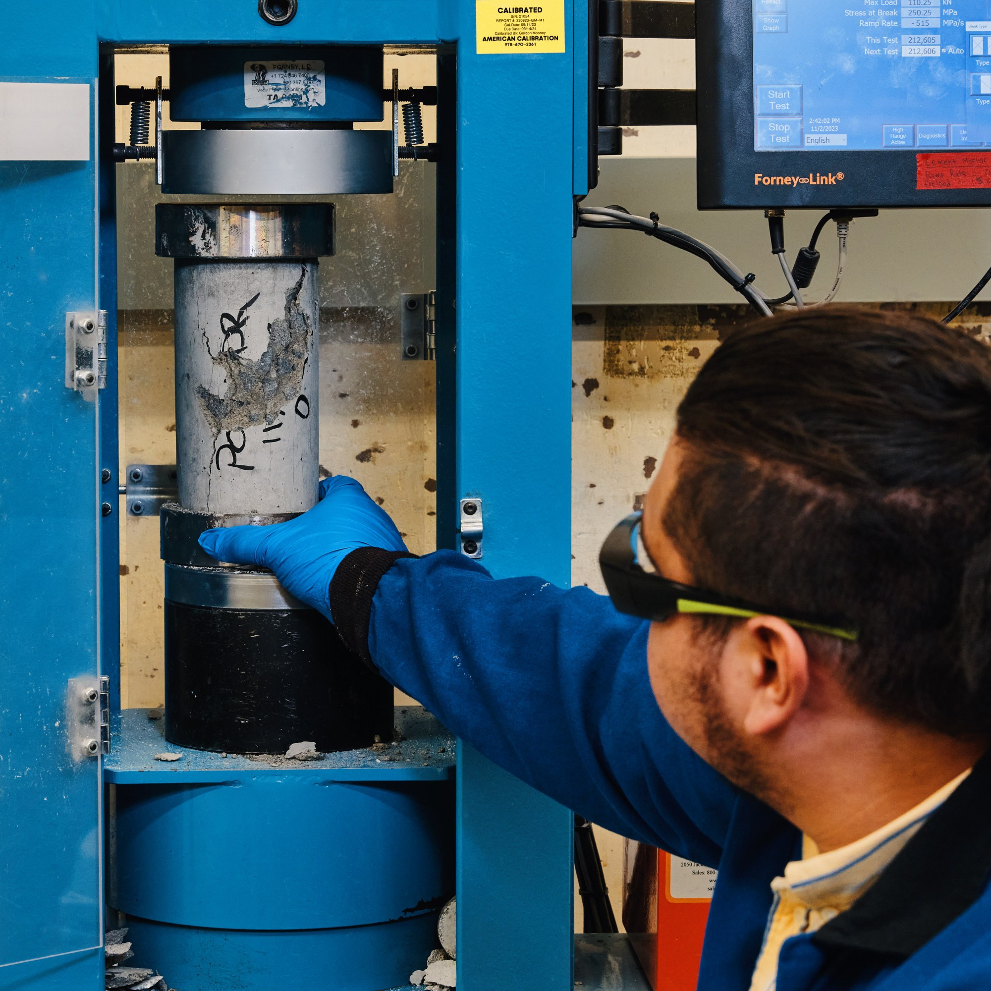 A Sublime employee tests the compressive strength of the company's cement in concrete cylinders.